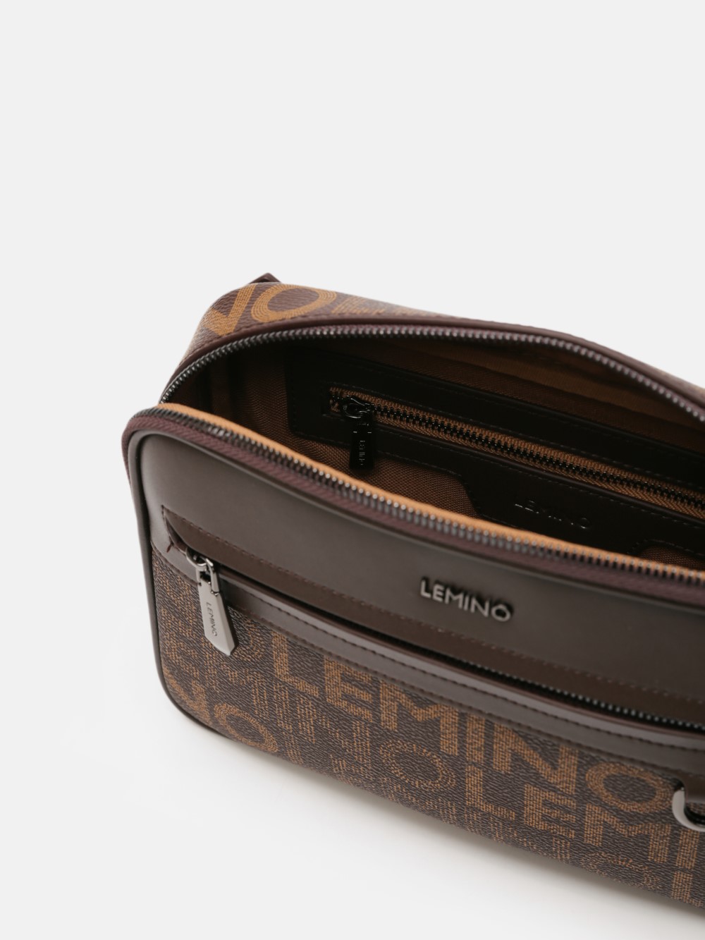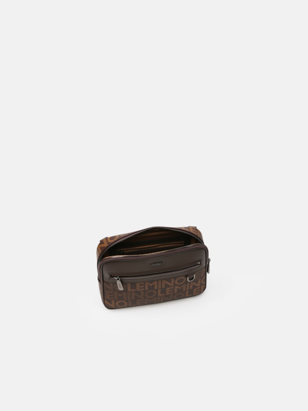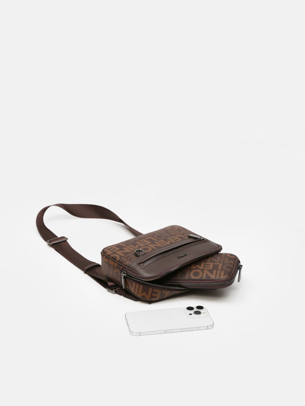 Túi đeo chéo nam LEMINO Monogram Canvas dáng camera bag gọn chắc, phối nắp trơn nam tính, có ngăn trước khóa kéo tiện dụng. Dây đeo bản to chỉnh được, đeo êm vai; một số phiên bản kèm túi phụ mini gắn dây.