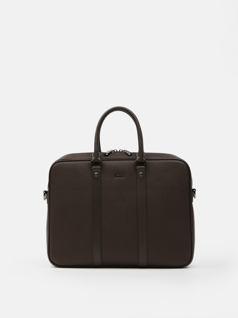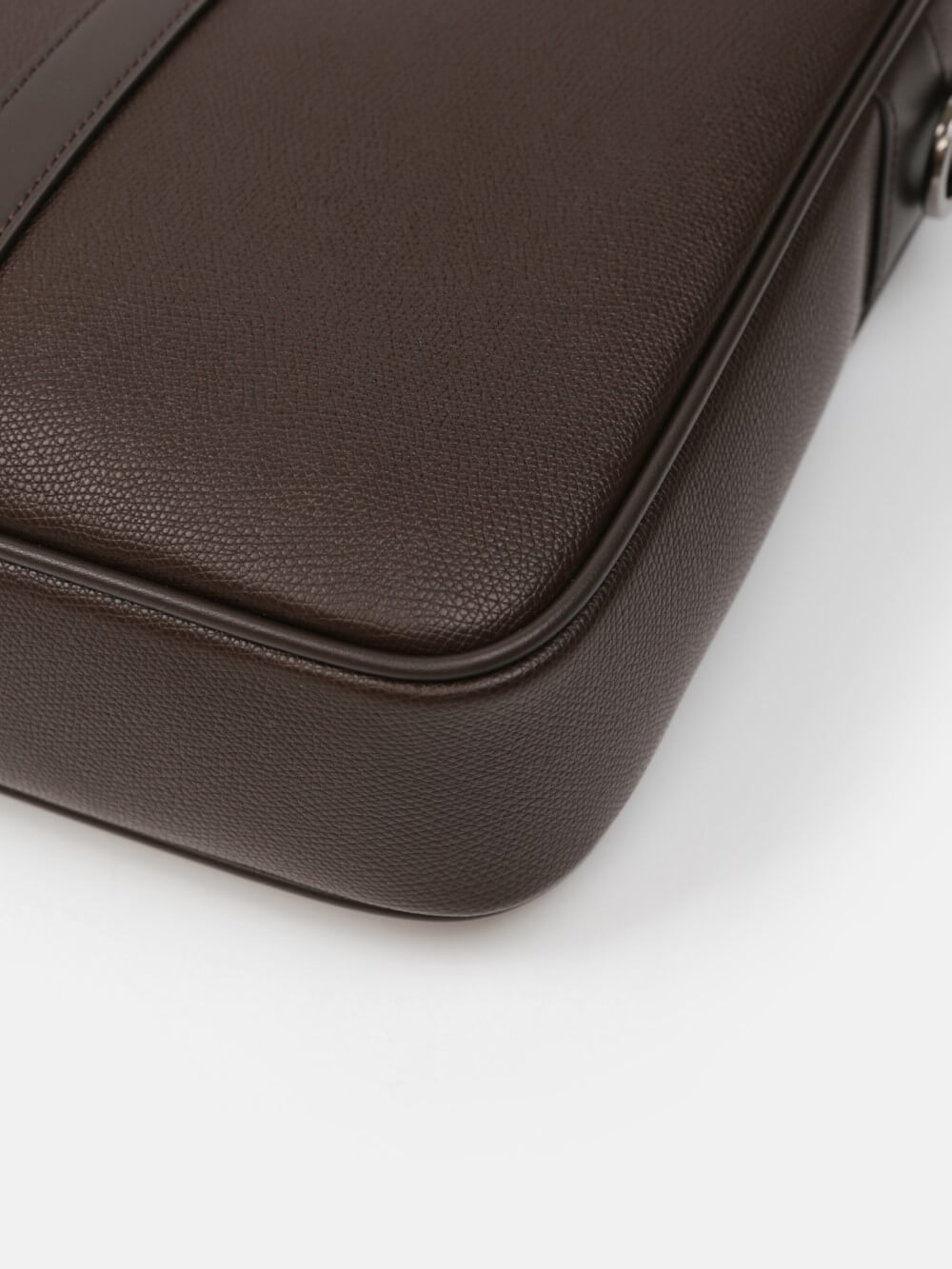 Cặp nam phom hộp tối giản, bề mặt da hạt chống xước nhẹ, điểm nhấn hai dải dọc và khoá kéo đôi kim loại trầm. Ngăn chính chứa tài liệu A4, laptop mỏng 13–14", bố trí thêm ngăn phụ cho điện thoại – bút – cáp. Đi kèm dây đeo bản rộng tháo rời và quai xách đôi, giữ phom đứng đẹp khi sử dụng. Dễ phối từ suit công sở đến smart-casual cuối tuần, giúp anh giữ vẻ gọn gàng và chuyên nghiệp suốt ngày dài.