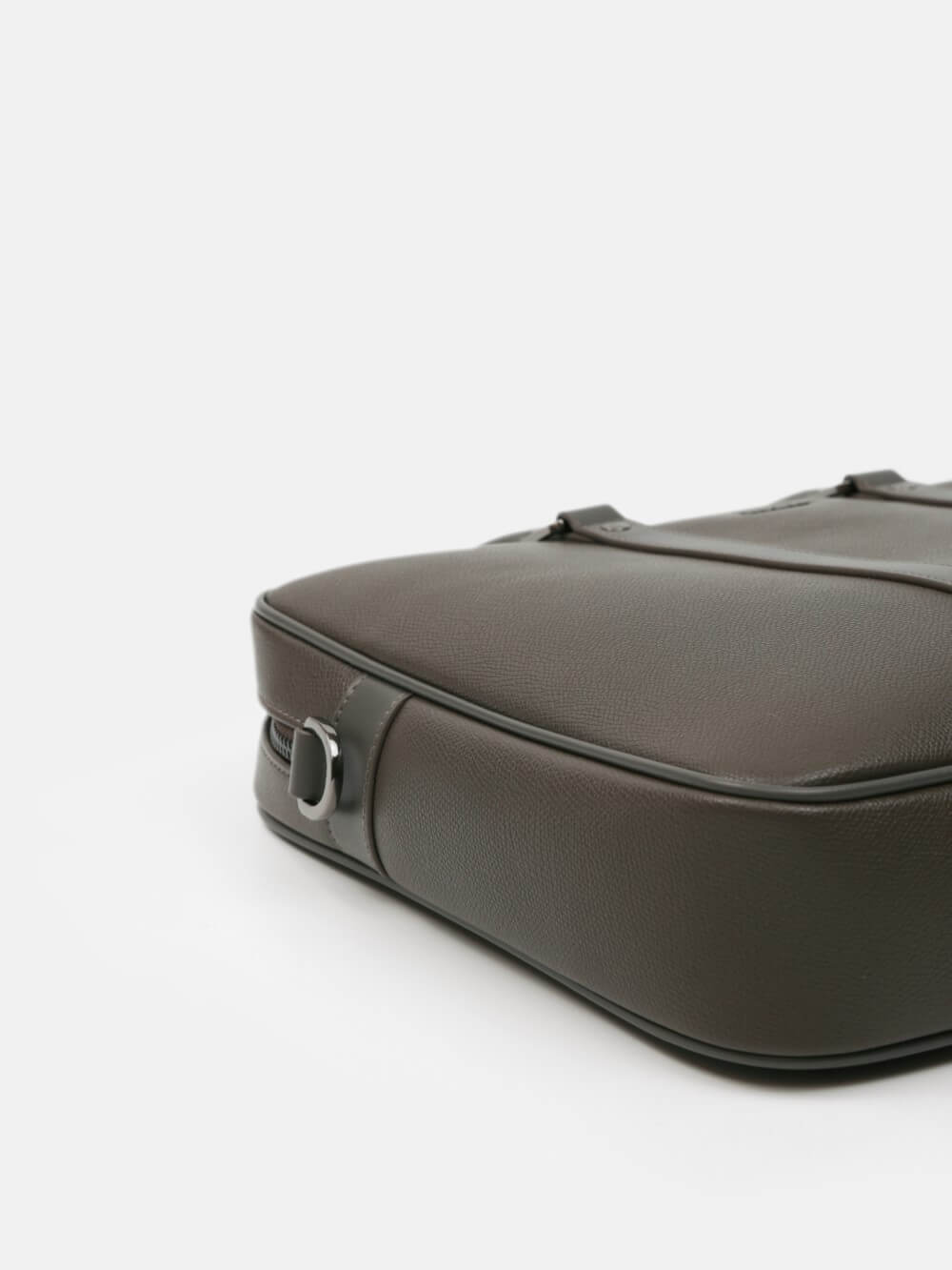 Cặp nam phom hộp tối giản, bề mặt da hạt chống xước nhẹ, điểm nhấn hai dải dọc và khoá kéo đôi kim loại trầm. Ngăn chính chứa tài liệu A4, laptop mỏng 13–14", bố trí thêm ngăn phụ cho điện thoại – bút – cáp. Đi kèm dây đeo bản rộng tháo rời và quai xách đôi, giữ phom đứng đẹp khi sử dụng. Dễ phối từ suit công sở đến smart-casual cuối tuần, giúp anh giữ vẻ gọn gàng và chuyên nghiệp suốt ngày dài.