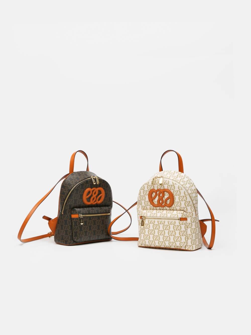 Balo mini monogram LEMINO – dáng cong gọn nhẹ, logo nổi tinh tế, phối da cam nâu sang nét. Thiết kế ngăn chính khóa kéo đôi và ngăn phụ phía trước tiện sắp xếp, phù hợp đi làm – dạo phố – du lịch.
