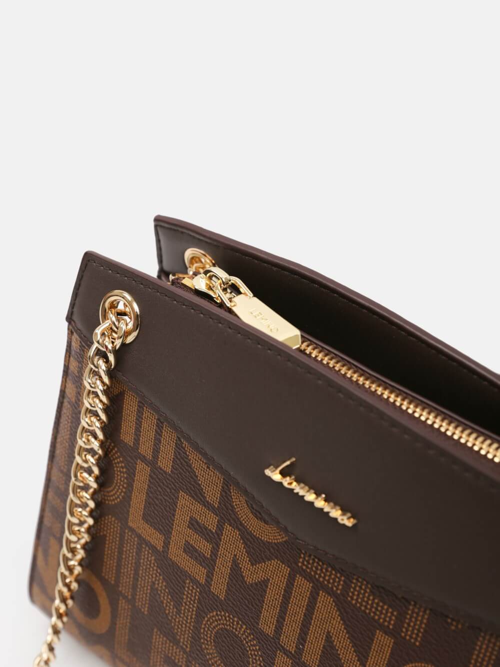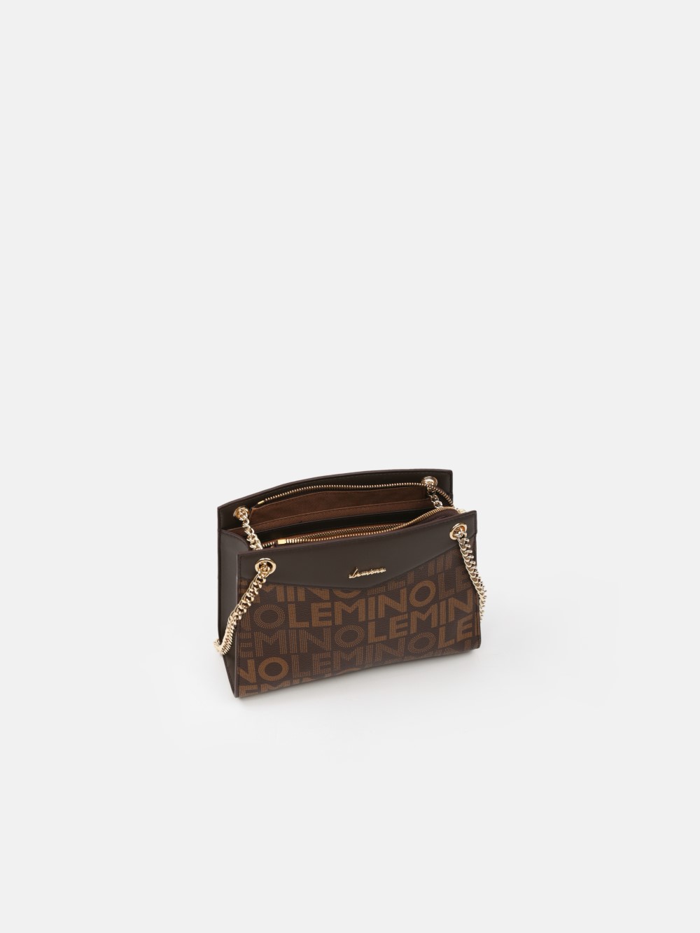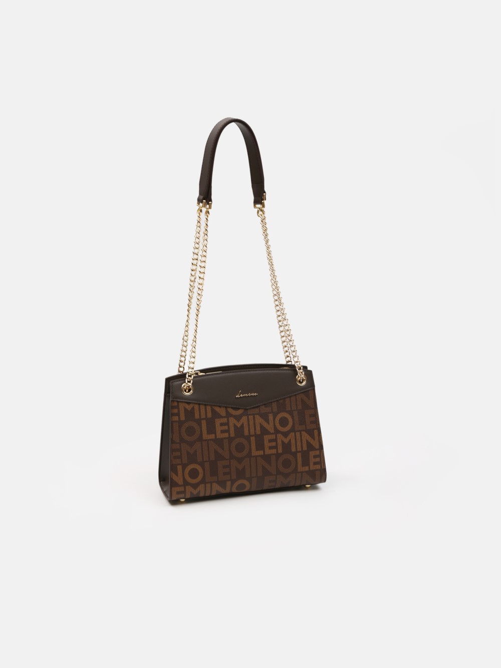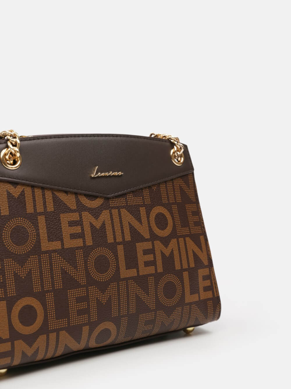 Túi LEMINO Monogram dáng trapeze đứng phom sang gọn, phối nắp màu nổi bật và dây xích ánh vàng kèm đệm da êm vai. Dễ phối đi làm – đi chơi