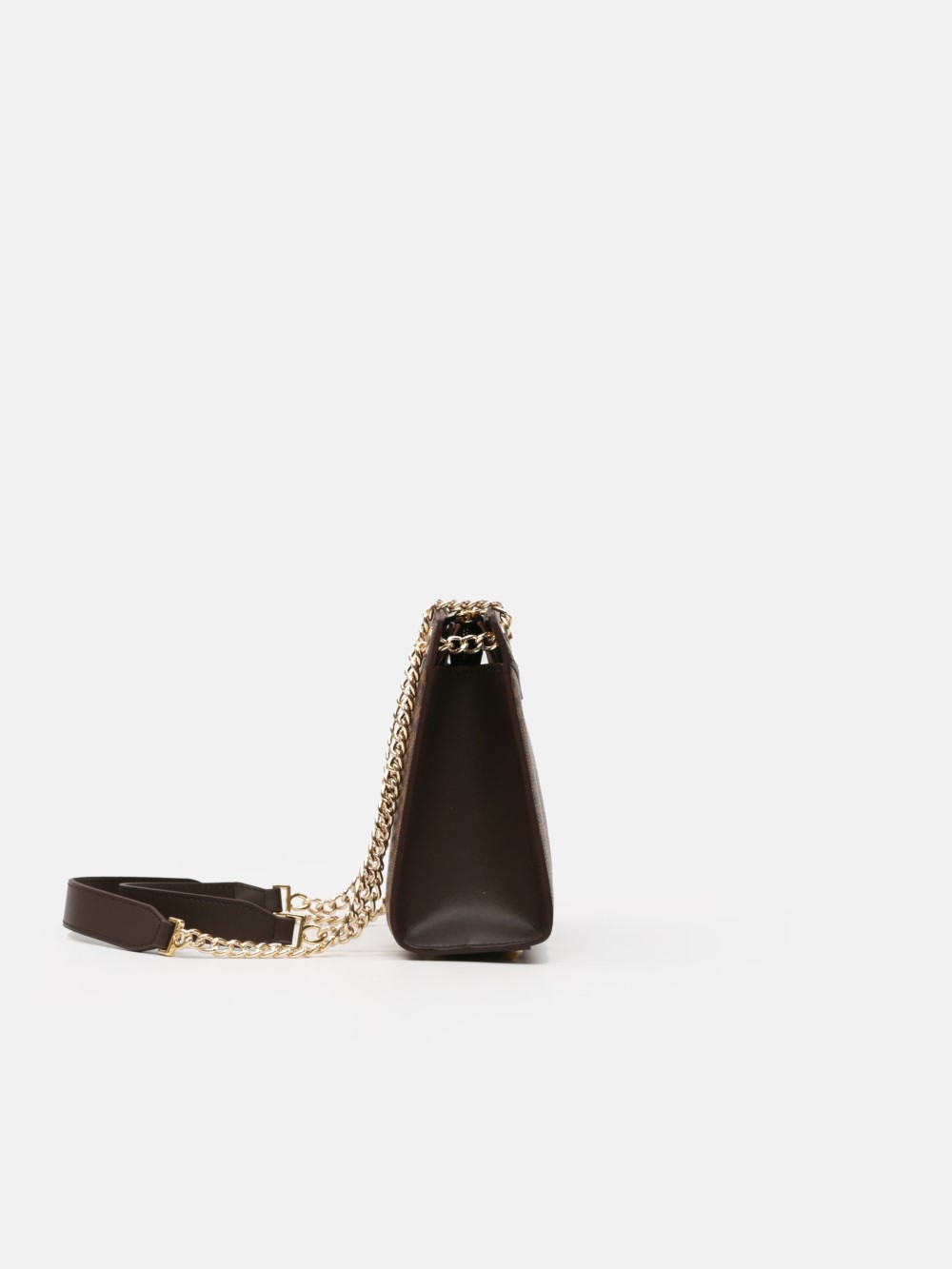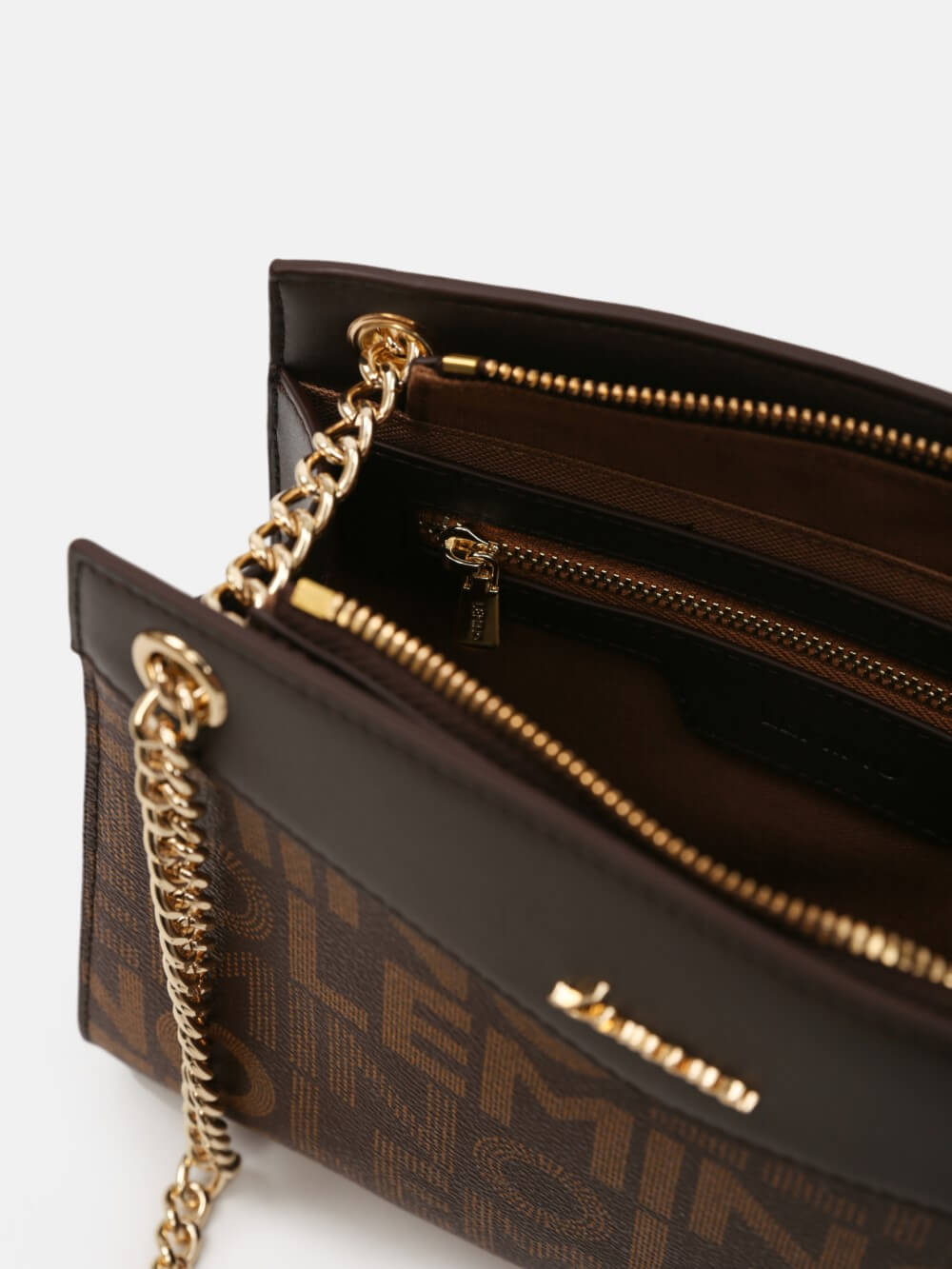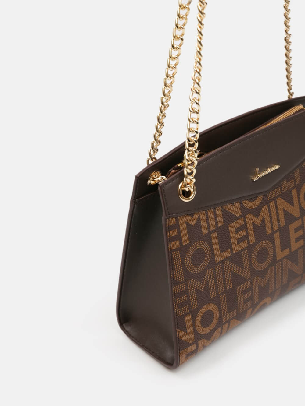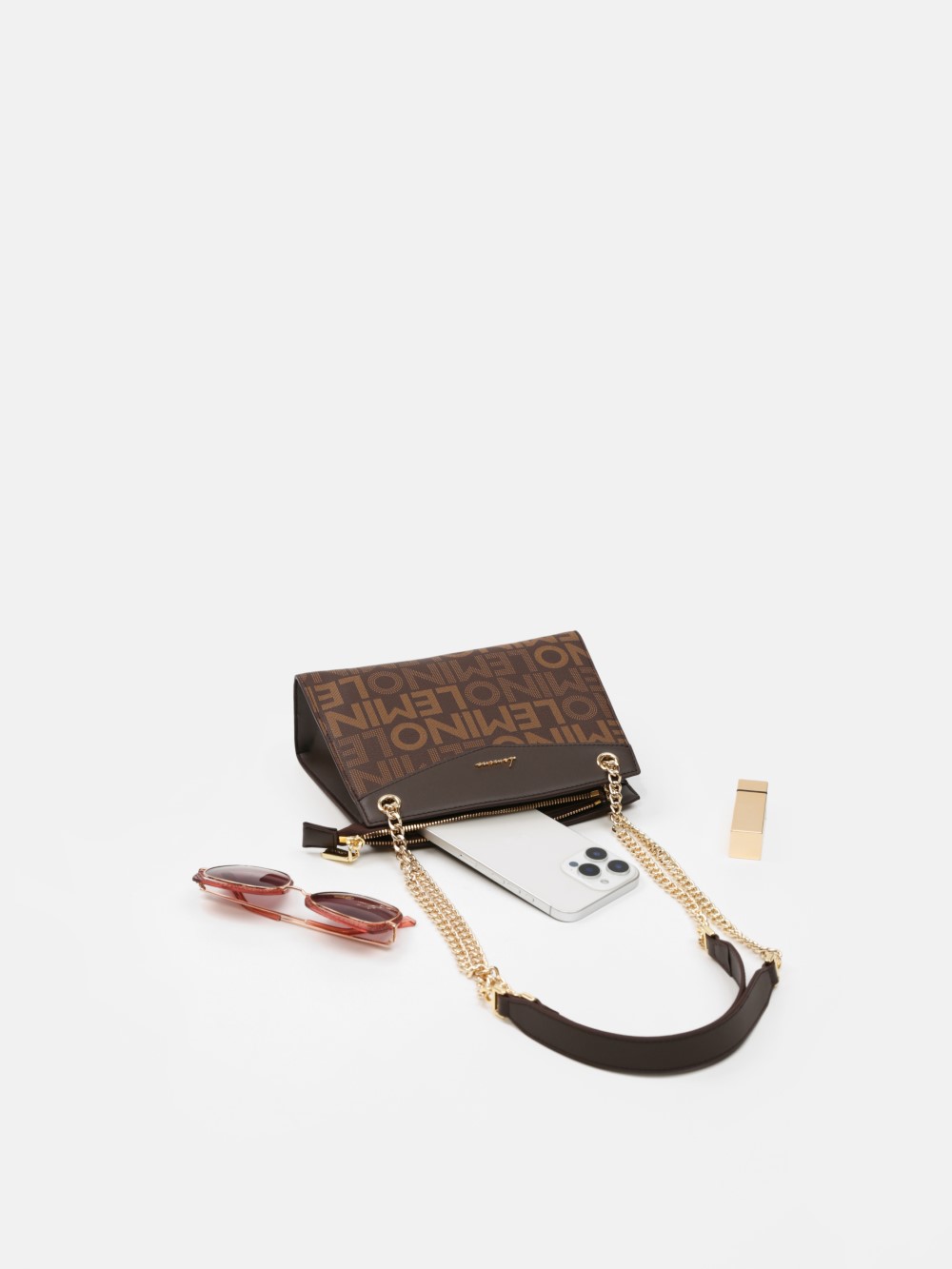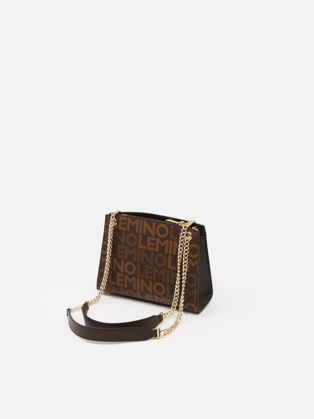 Túi LEMINO Monogram dáng trapeze đứng phom sang gọn, phối nắp màu nổi bật và dây xích ánh vàng kèm đệm da êm vai. Dễ phối đi làm – đi chơi
