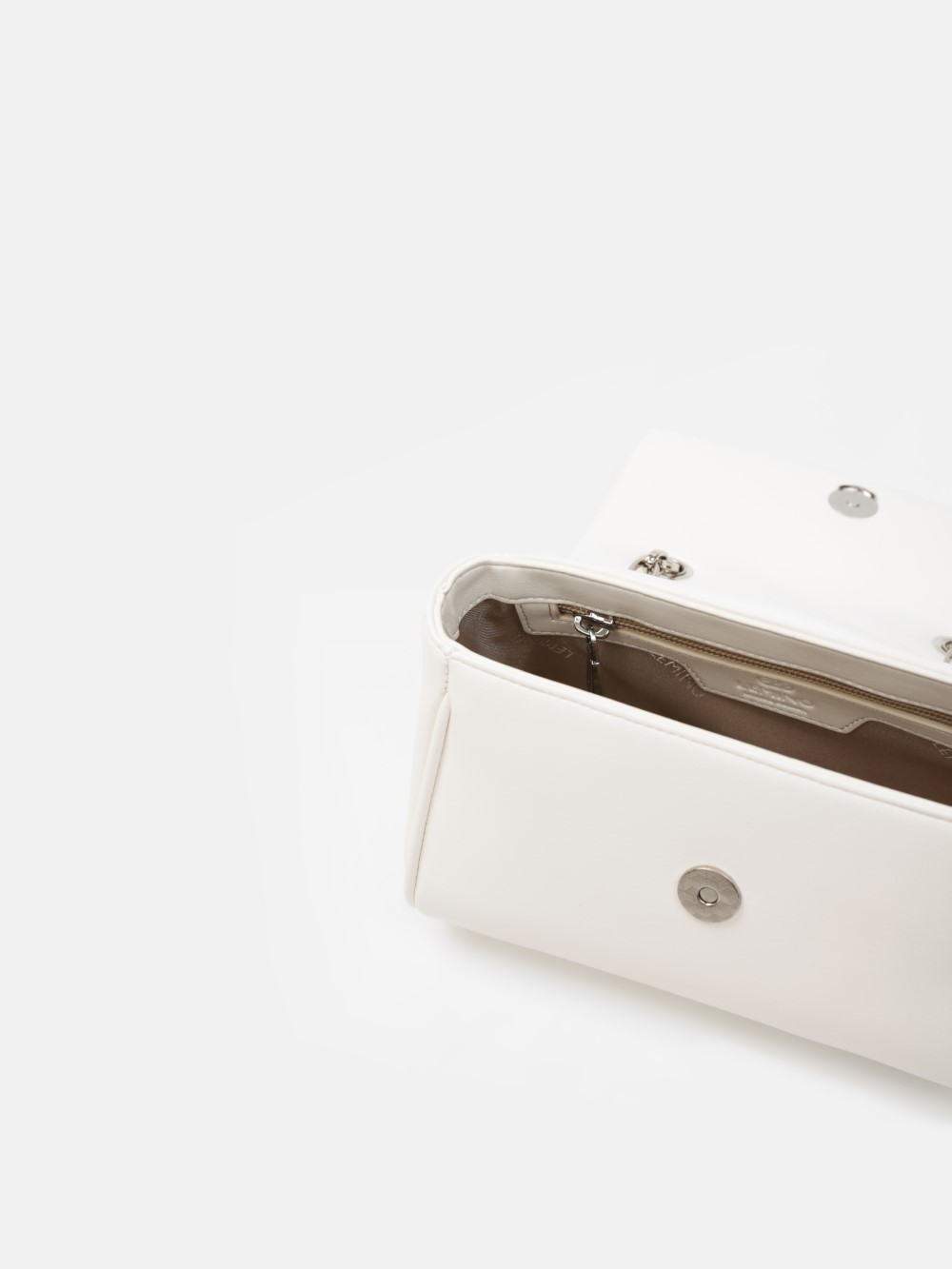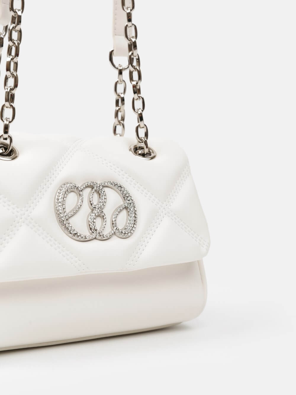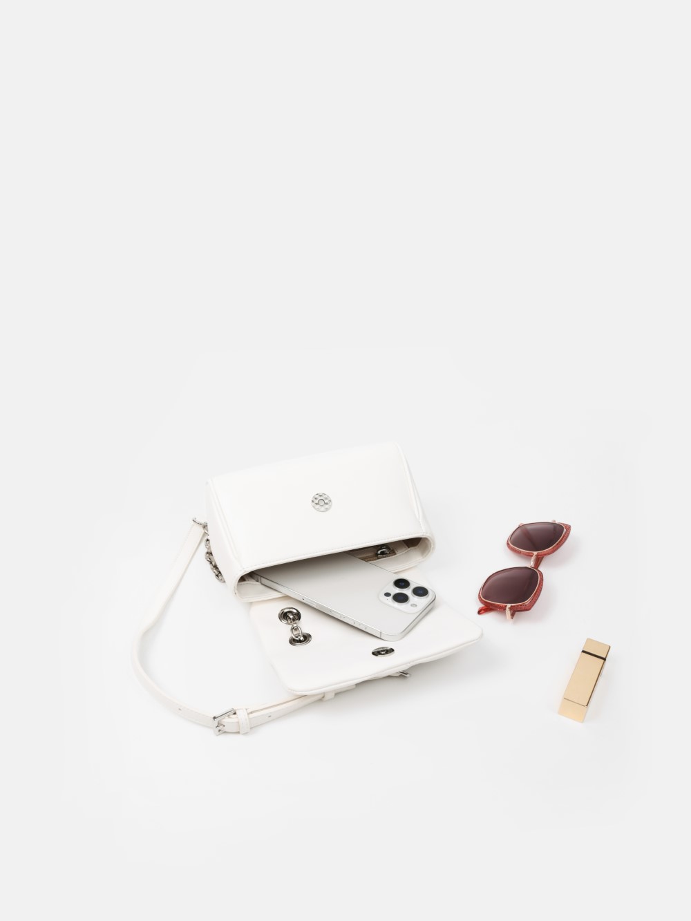 Nắp gập thanh lịch, điểm nhấn logo kim loại sang. Dây đeo xích kết hợp dây da điều chỉnh, linh hoạt đeo vai hoặc đeo chéo.