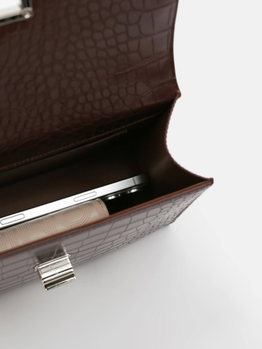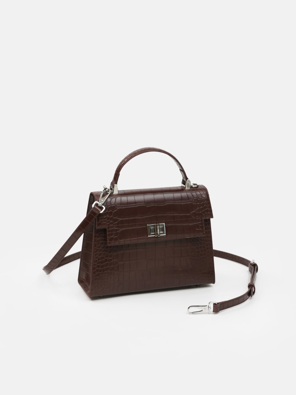 Dáng hộp sang trọng với bề mặt da vân cá sấu, khóa xoay kim loại và quai xách tay thanh lịch. Kèm dây đeo chéo linh hoạt – lý tưởng cho đi làm, dự tiệc, dạo phố.